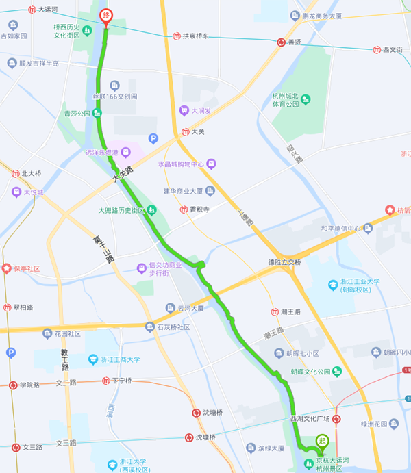本次活動(dòng)線路是沿著運(yùn)河游步道,西湖文化廣場(chǎng)走到運(yùn)河文化廣場(chǎng)拱宸橋下,全長(zhǎng)約5.5公里,全程用時(shí)約1小時(shí)20分鐘。