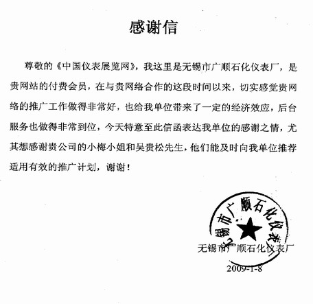 無錫市廣順石化儀表廠在中國儀表展覽網(wǎng)的服務(wù)下,開展網(wǎng)絡(luò)推廣營銷,為企業(yè)產(chǎn)品銷售和渠道拓展起到了切實的推動作用。廣順石化儀表特意傳來感謝信,表達(dá)了對中國儀表展覽網(wǎng)和相關(guān)工作人員的贊賞和感謝。