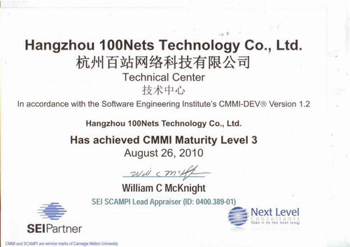 2010年8月26日上午,在杭州百站網(wǎng)絡(luò)科技有限公司會議室舉行的CMMI3級認(rèn)證結(jié)果報告會上,來自美國的評估師Will鄭重宣布:經(jīng)過嚴(yán)格的現(xiàn)場審核和評估,百站網(wǎng)絡(luò)已達成CMMI3級目標(biāo),成功通過CMMI3級認(rèn)證。