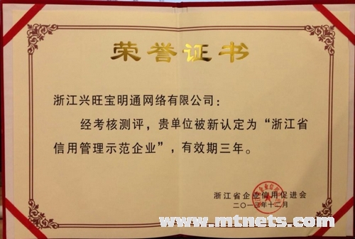 日前,浙江興旺寶明通網(wǎng)絡(luò)有限公司通過(guò)“浙江省信用管理示范企業(yè)”的審核認(rèn)定,榮譽(yù)資質(zhì)又添一項(xiàng)。誠(chéng)信為本是企業(yè)文化的第一條,也是最重要的一條,對(duì)社會(huì)誠(chéng)信,對(duì)客戶誠(chéng)信,對(duì)同事誠(chéng)信是所有明通人的核心價(jià)值觀。