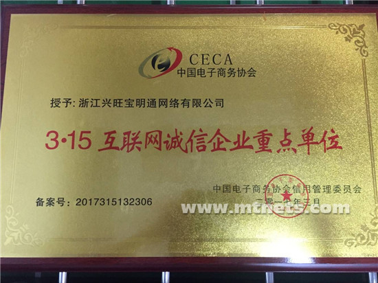 我司經(jīng)過嚴格的評審、認證并通過,榮獲了由中國電子商務協(xié)會(CECA)頒發(fā)的“3.15互聯(lián)網(wǎng)誠信企業(yè)重點單位”榮譽稱號,近日獲得相關證書牌照,成為互聯(lián)網(wǎng)行業(yè)獲得“誠信網(wǎng)站”認證企業(yè)之一。憑借優(yōu)質(zhì)的服務質(zhì)量、行業(yè)信譽度和良好的企業(yè)社會責任,我司通過權(quán)威行業(yè)評審,為客戶們提供了多一層安全保障。獲此殊榮是中國電子商務協(xié)會對興旺寶的充分認可,也是對興旺寶人的工作極大肯定。