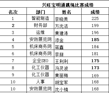 第一名是來自智能制造網(wǎng)的李曉美,一分鐘跳繩成績高達(dá)225次,小編看到這兒已經(jīng)驚呆了,要知道我國一分鐘跳繩最高記錄就是286次,果然天外有天,高手在民間啊。值得一提的是,這位小伙伴也是公司全體參賽人員中唯一突破200個大關(guān)的選手,果然就像主持人介紹的那樣,別看人家看著個子小,爆發(fā)起來是一鳴驚人,厲害!